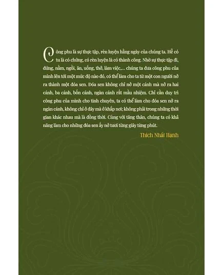 “Công phu là sự thực tập, sự rèn luyện hằng ngày của chúng ta. Hễ có tu là có chứng, có rèn luyện là có thành công. Nhờ sự thực tập đi, đứng, nằm, ngồi, ăn, uống, thở, làm việc,… chúng ta đưa công phu của mình lên tới một mức độ nào đó, có thể làm cho ta từ một con người nở ra thành một đóa sen. Đóa sen không chỉ nở một cánh mà nở ra hai cánh, ba cánh, bốn cánh, ngàn cánh rất mầu nhiệm. Chỉ cần duy trì công phu của mình cho tinh chuyên, ta có thể làm cho đóa sen nở ra ngàn cánh, không chỉ ở đây mà ở khắp nơi; không phải trong những thời gian khác nhau mà là đồng thời. Cùng với tăng thân, chúng ta có khả năng làm cho những đóa sen ấy nở tươi từng giây từng phút.” (Thích Nhất Hạnh)