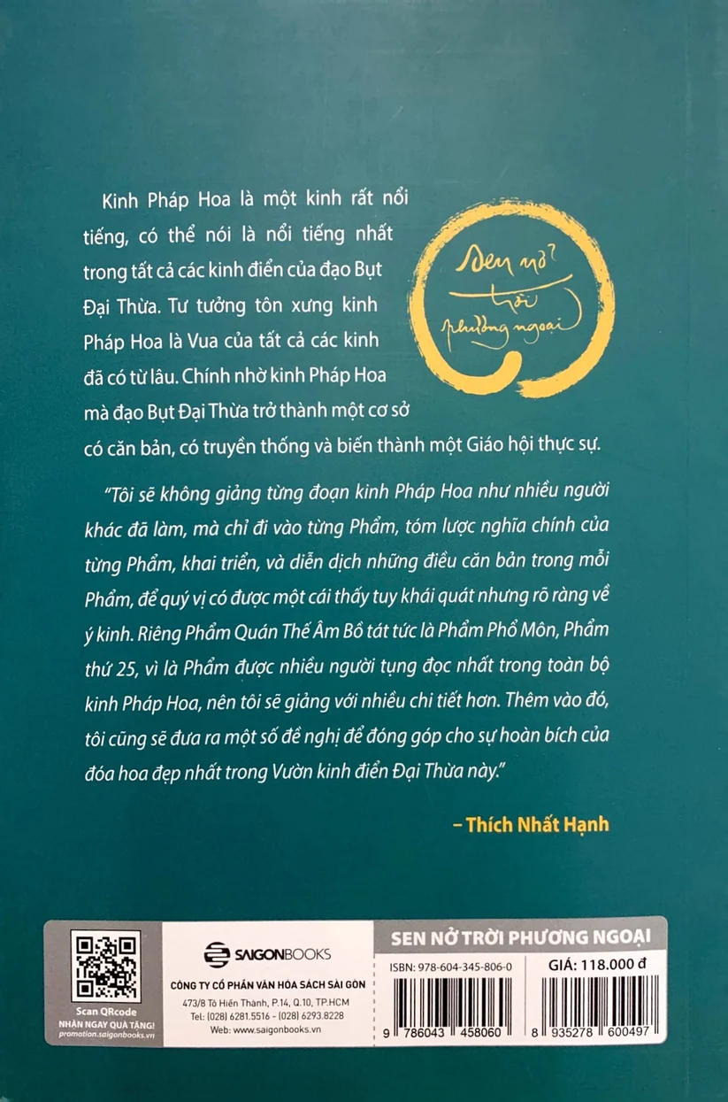 Với Sen nở trời phương ngoại, Thiền sư Thích Nhất Hạnh sẽ không giảng từng đoạn kinh Pháp Hoa như nhiều người khác đã làm, mà chỉ đi vào từng Phẩm, tóm lược nghĩa chính của từng Phẩm, khai triển, và diễn dịch những điều căn bản trong từng Phẩm, để quý vị độc giả có được một cái thấy tuy khái quát nhưng rõ ràng về ý kinh. Riêng Phẩm Quán Thế Âm Bồ tát tức là Phẩm Phổ Môn, Phẩm thứ 25, vì là Phẩm được nhiều người tụng đọc nhất trong toàn bộ kinh Pháp Hoa, nên Thiền sư sẽ giảng với nhiều chi tiết hơn. Thêm vào đó, Người cũng sẽ đưa ra một số đề nghị để đóng góp cho sự hoàn bích của đóa hoa đẹp nhất trong Vườn kinh điển Đại Thừa này